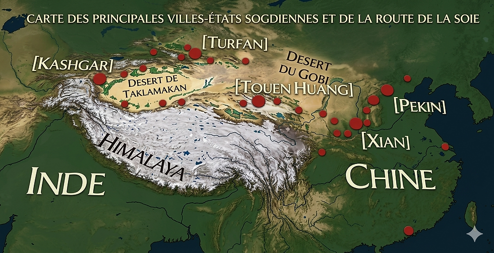 En un tiempo y espacio distintos, un pequeño pueblo de Asia Central, receptor de diversas y discrepantes tradiciones culturales, seguiría, sin conocer, un comportamiento similar al fenicio, aunque esta vez conquistando comercialmente las cuencas desérticas de Taklamakán y Gobi. Los sogdianos conocían las rutas comerciales desérticas de Asia, por lo que guiaban extensas caravanas por la antigua Ruta de la Seda. Tras haber sido conquistados recurrentemente por grandes imperios, éste pueblo logró desarrollar gran adaptabilidad y resiliencia, convirtiéndose en un grupo étnico con talentos mercantiles únicos. Entre el 300 a.C y 200 d.C, los sogdianos fueron generando una red de ciudades-estado ubicadas alrededor del desierto, la más conocida de ellas es Samarkanda.